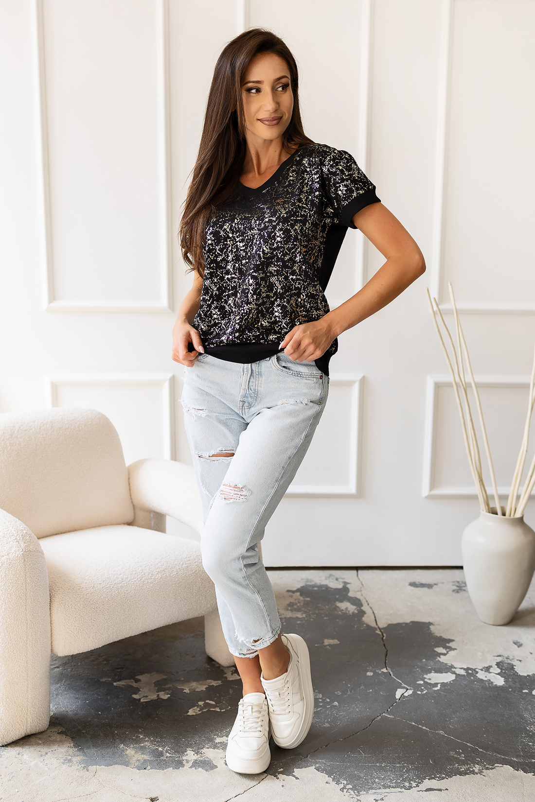 Bluzka w złote kreseczki ,dekoltem w serek. Wykonana z dobrej jakości materiału serek jak i dół bluzki wykończone ściągaczem .Świetnie sprawdzi się jako baza do wszelkiego rodzaju stylizacji. Idealna na co dzień.