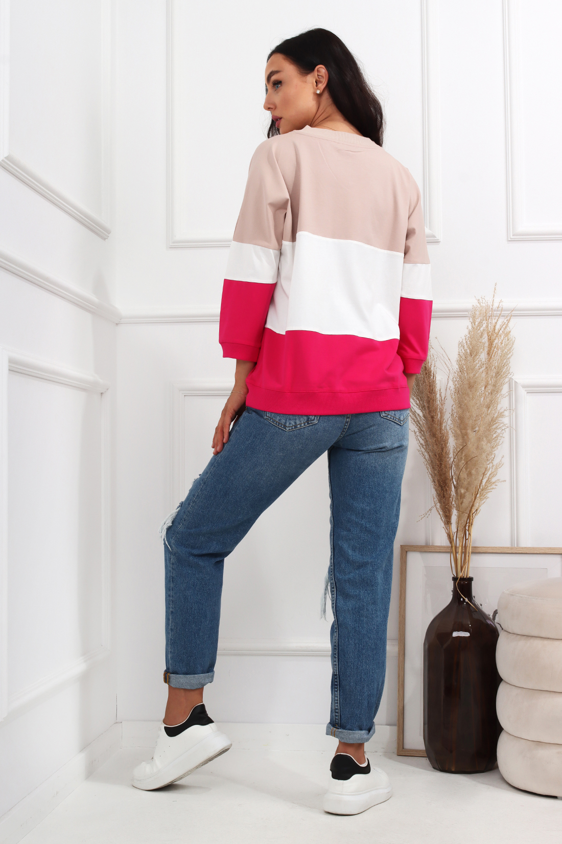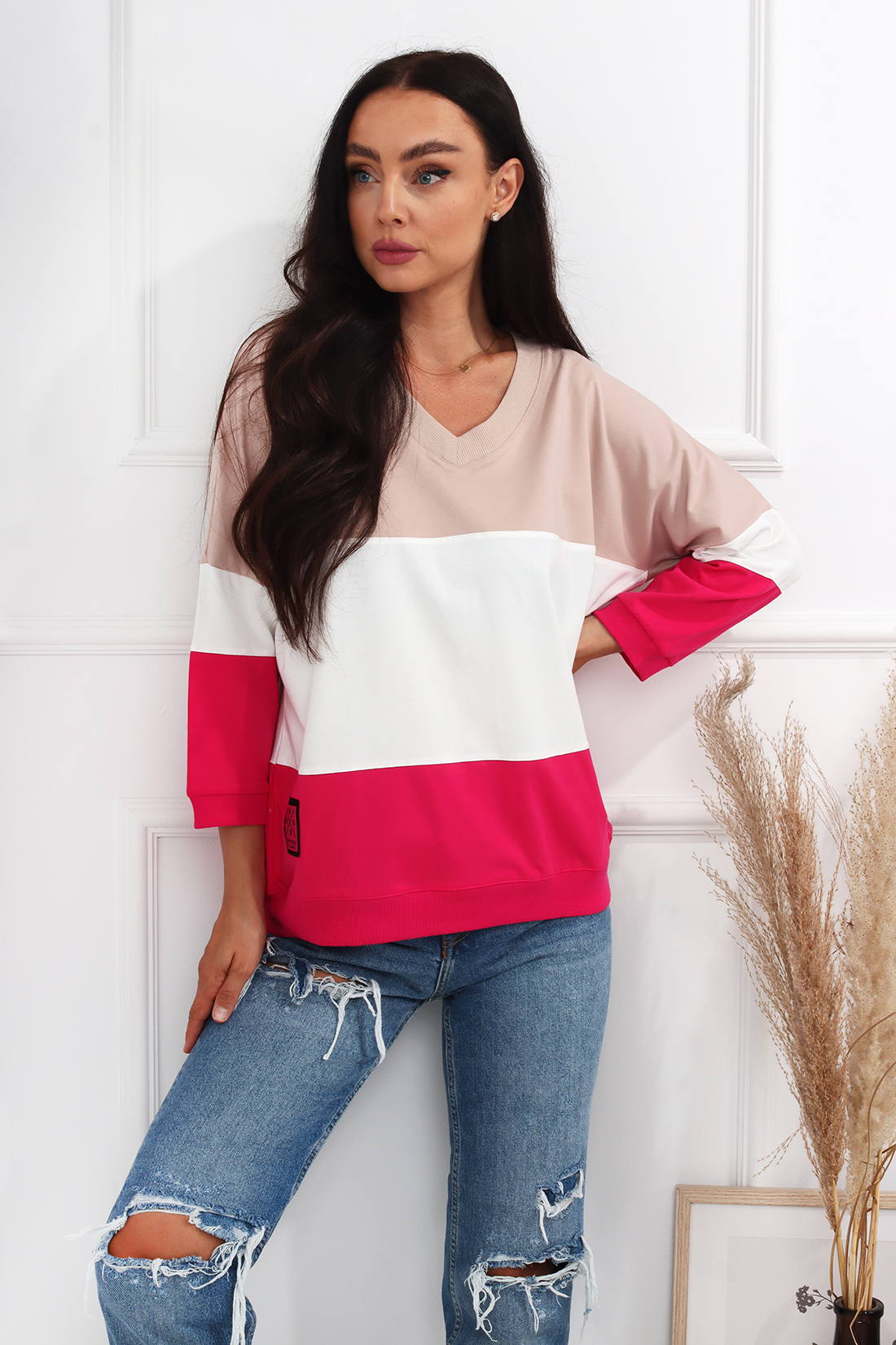 Bluzka trzykolorowa , rękaw 3/4 wykonana z wysokiej jakości materiału. Posiada okrągły dekold. Ten model to idealna baza do codziennych stylizacji. Świetnie zaprezentuje się w luźnym wydaniu, w połączeniu ze spodniami. Produkt dostępny jest w kilku wersjach kolorystycznych.