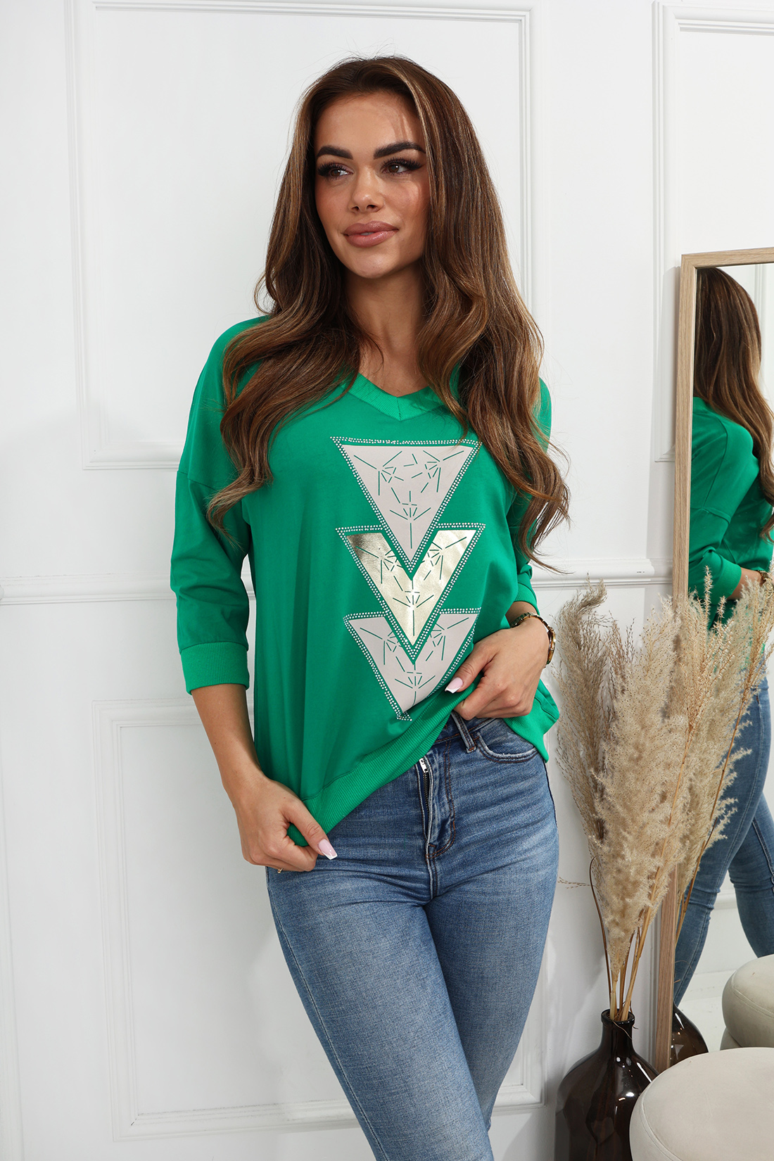 Bluzka z modnym nadrukiem na  3/4 rękawem i dekoltem w serek. Wykonana z dobrej jakości materiału rękawy jak i dół bluzki wykończone ściągaczem .Świetnie sprawdzi się jako baza do wszelkiego rodzaju stylizacji. Idealna na co dzień.