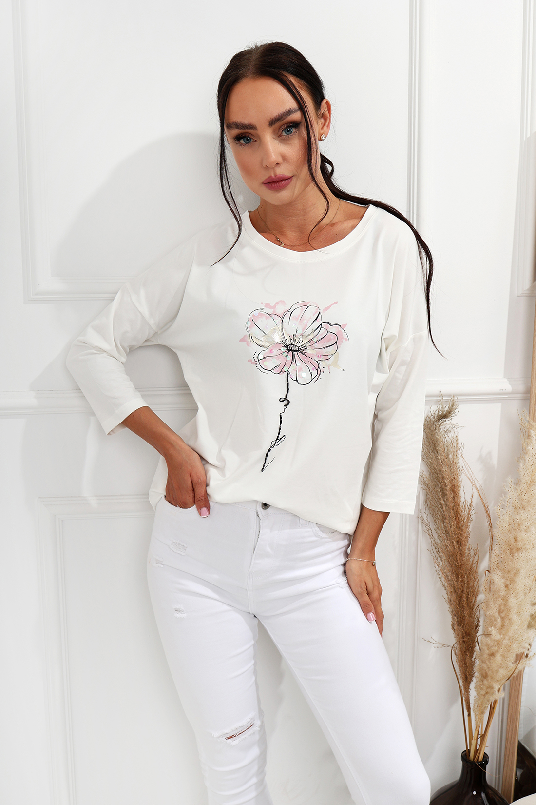 Bluzka krótszy przód i dłuższy tył  fason z oryginalnym nadrukiem z przodu. Ten model to propozycja idealna na co dzień! Świetnie zaprezentuje się  zestawiona z szortami, a także klasycznymi jeansami. Produkt dostępny jest w wariantach kolorystycznych.