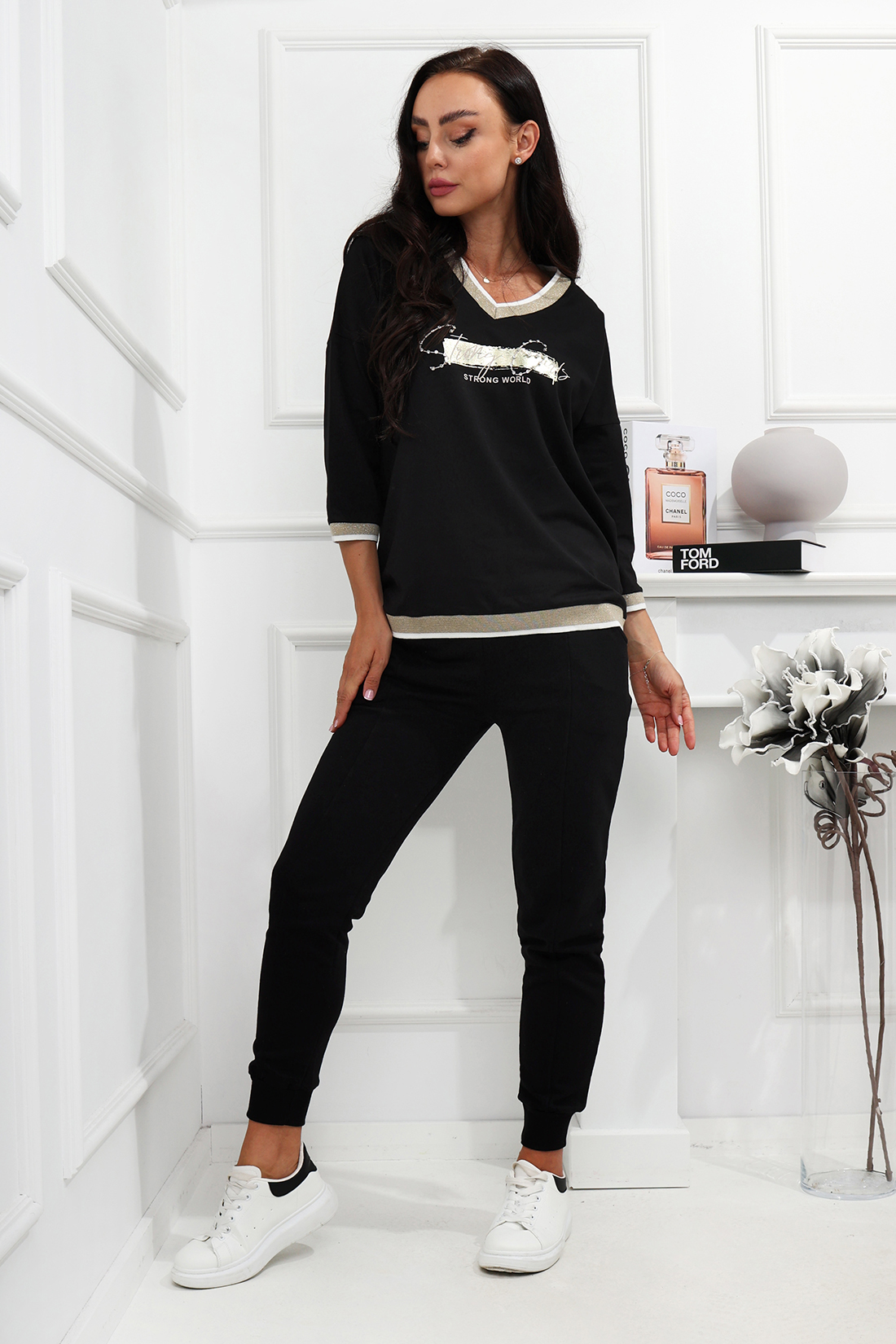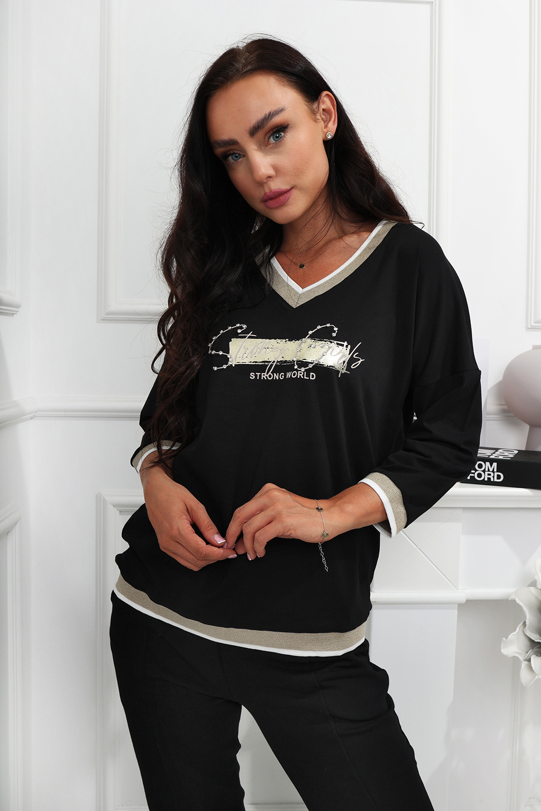 Bluzka z modnym nadrukiem na  3/4 rękawem i dekoltem w serek. Wykonana z dobrej jakości materiału rękawy jak i dół bluzki wykończone ściągaczem .Świetnie sprawdzi się jako baza do wszelkiego rodzaju stylizacji. Idealna na co dzień.