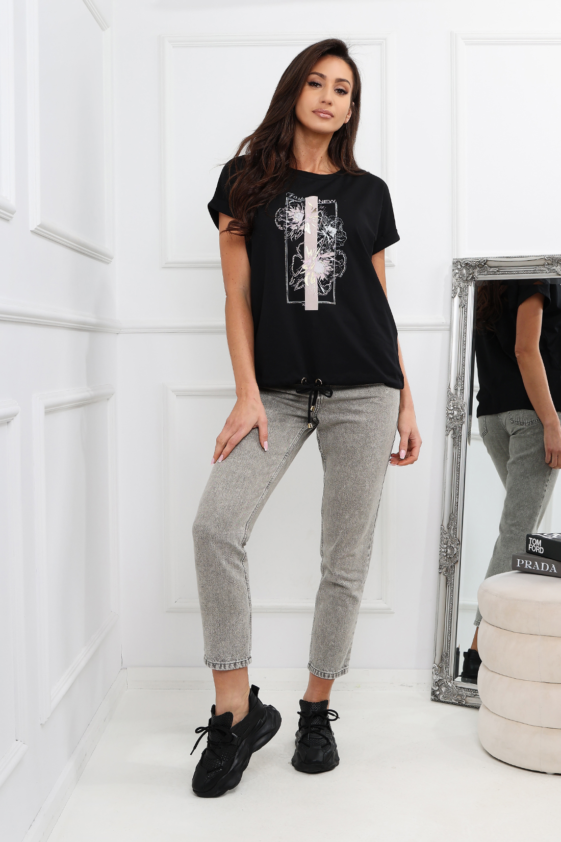 Bluzka z nadrukiem z przodu. Fason wyróżnia się sciągaczem na dole ze sznureczkiem co nadaje mu charakteru. Ten model fantastycznie zaprezentuje się zestawiony z codziennymi stylizacjami. Produkt wykonany został z wysokiej jakości materiału.