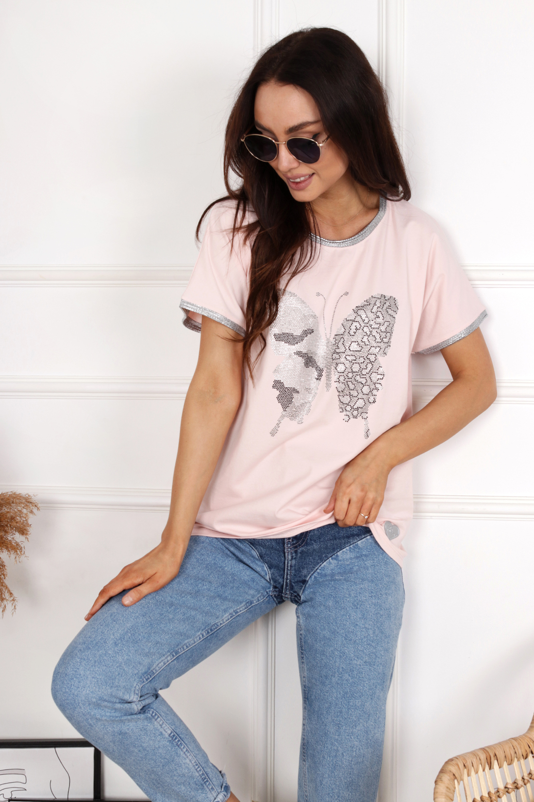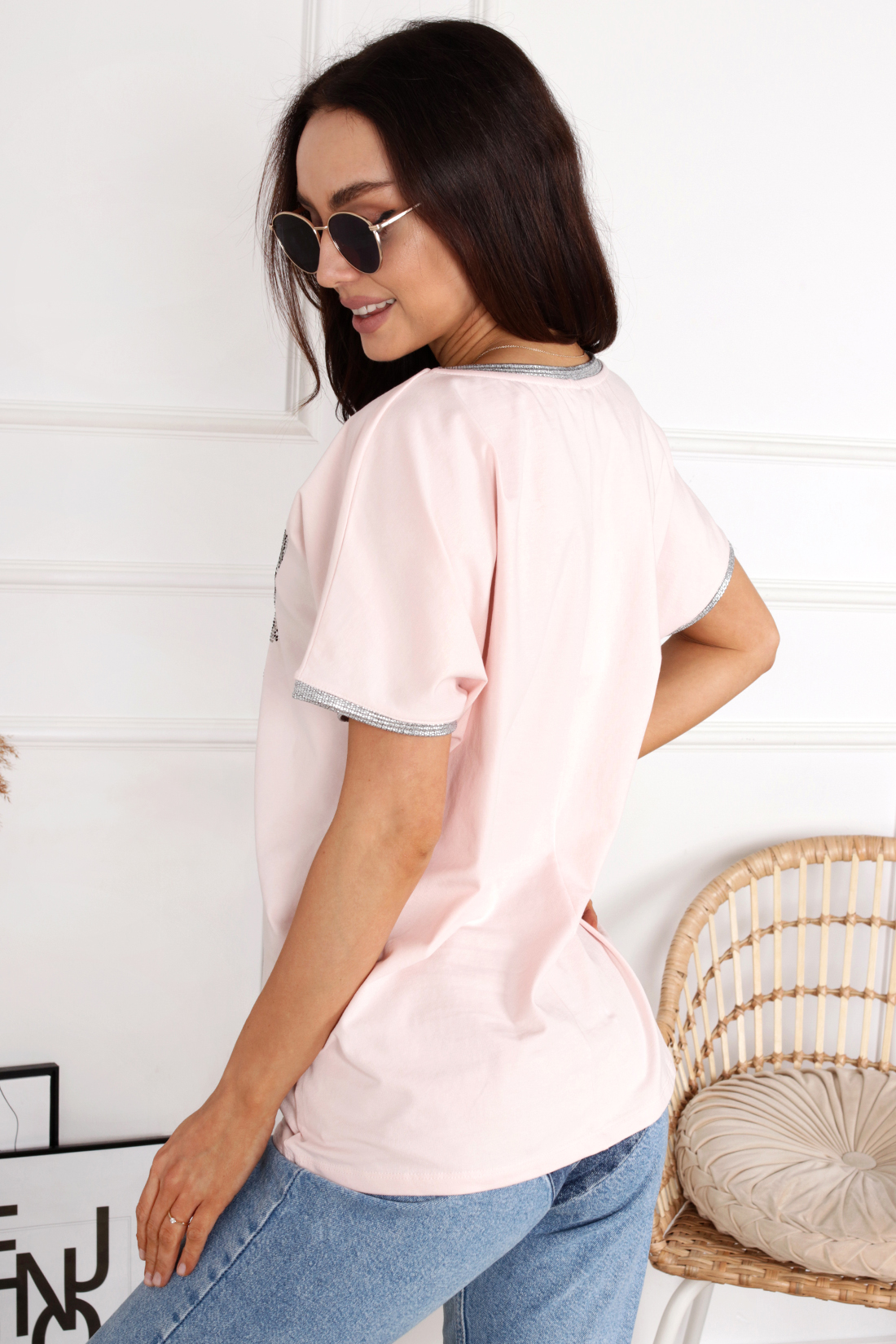 Klasyczny damski t-shirt z modną aplikacją. Ponadczasowa bluzka, która pasuje do każdej stylizacji i na każdą okazję. Model wykonany z miękkiej i przyjemnej w dotyku bawełny, która zapewni komfort noszenia przez cały dzień.