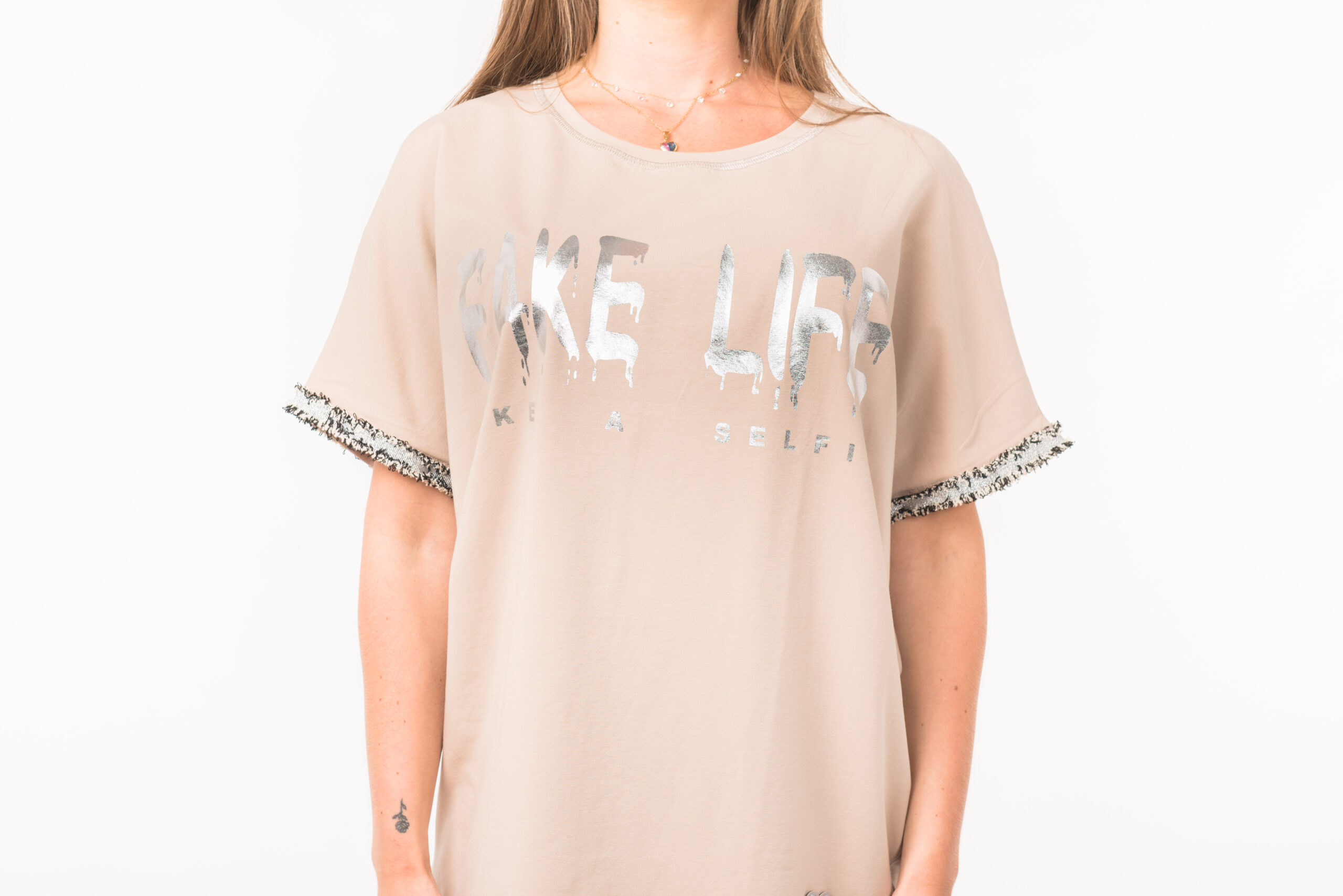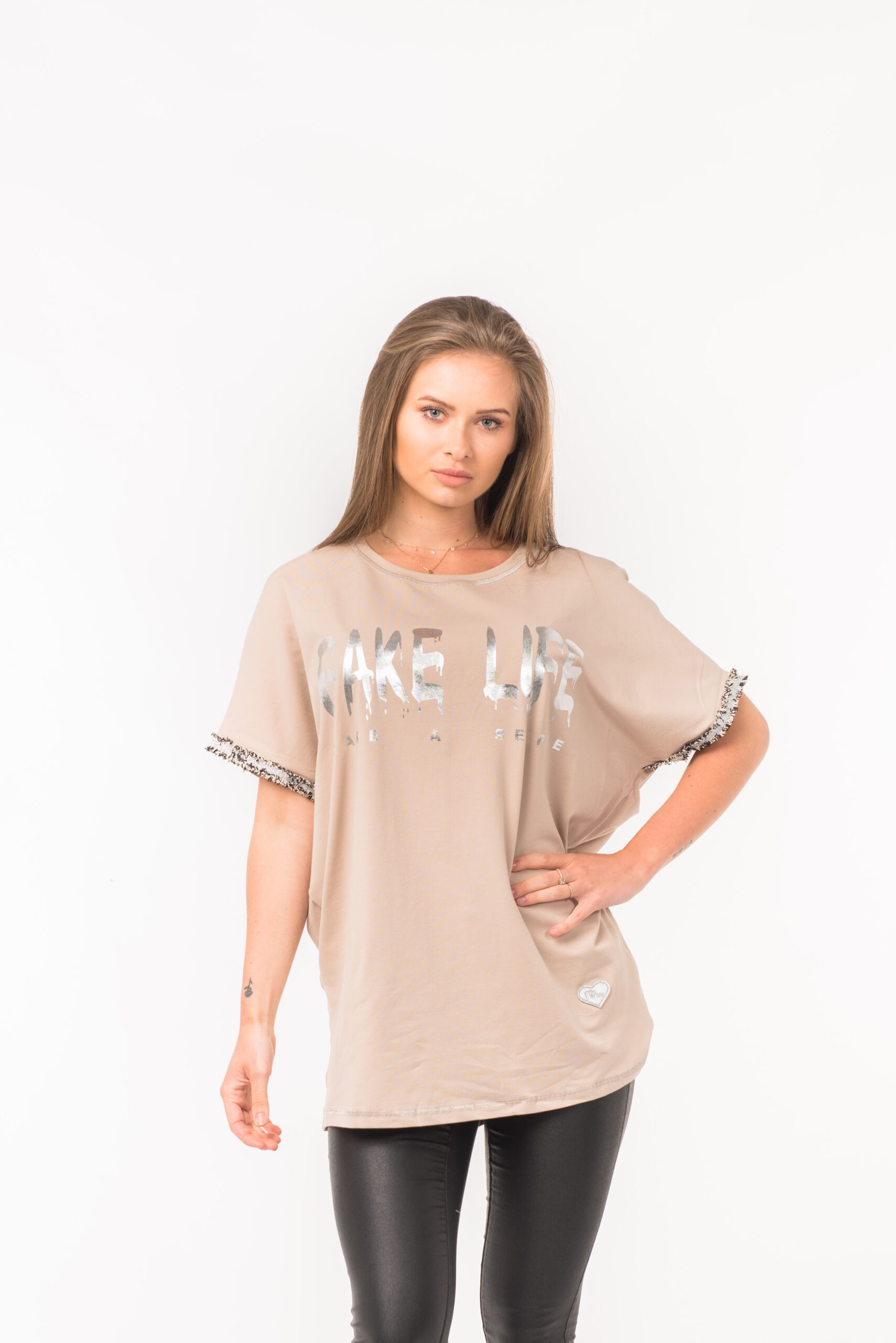 Damska, czarna bawełniana bluzka. Uniwersalna wygodna luźna, stylowy zdobiony srebrnym nadrukiem.