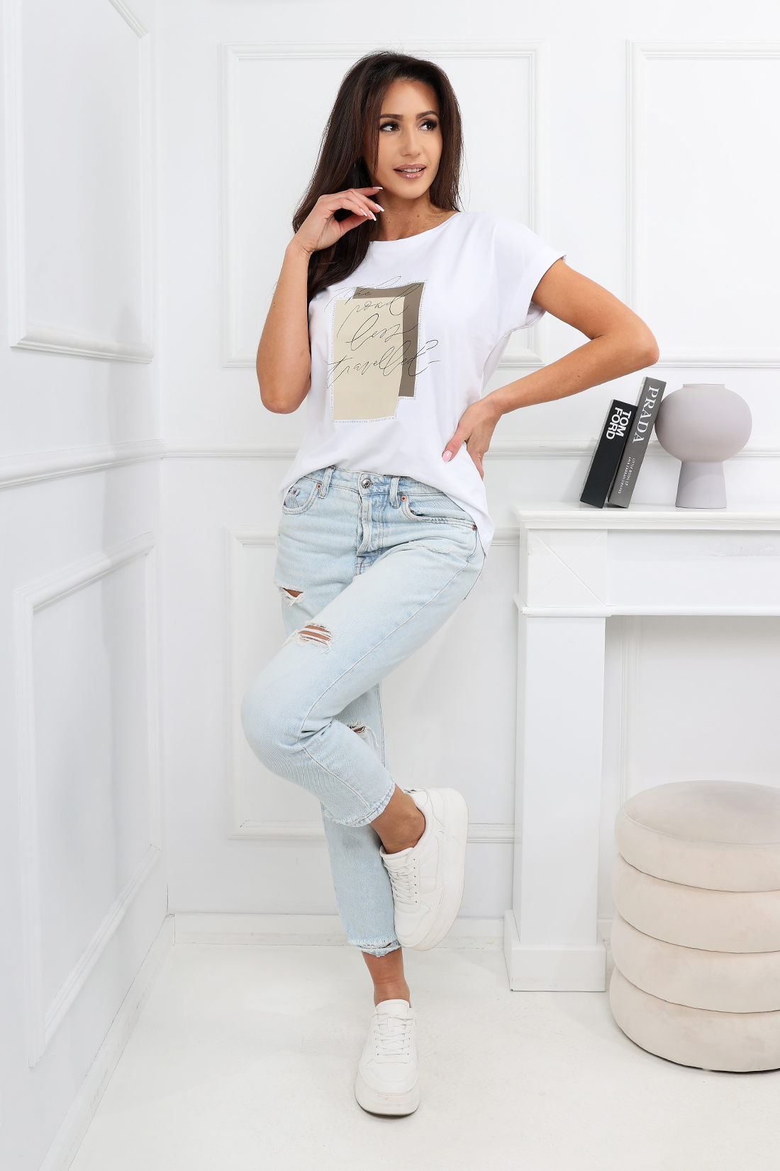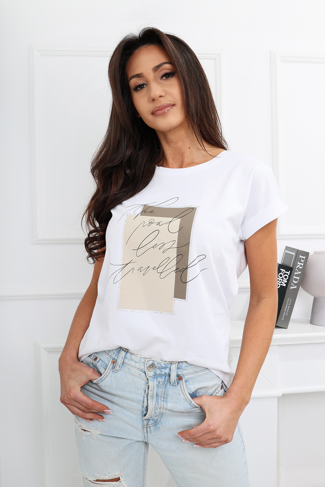 Klasyczny damski t-shirt z lekko asymetrycznym dołem i modnym nadrukiem. Ponadczasowa bluzka, która pasuje do każdej stylizacji i na każdą okazję. Model wykonany z miękkiej i przyjemnej w dotyku bawełny, która zapewni komfort noszenia przez cały dzień.