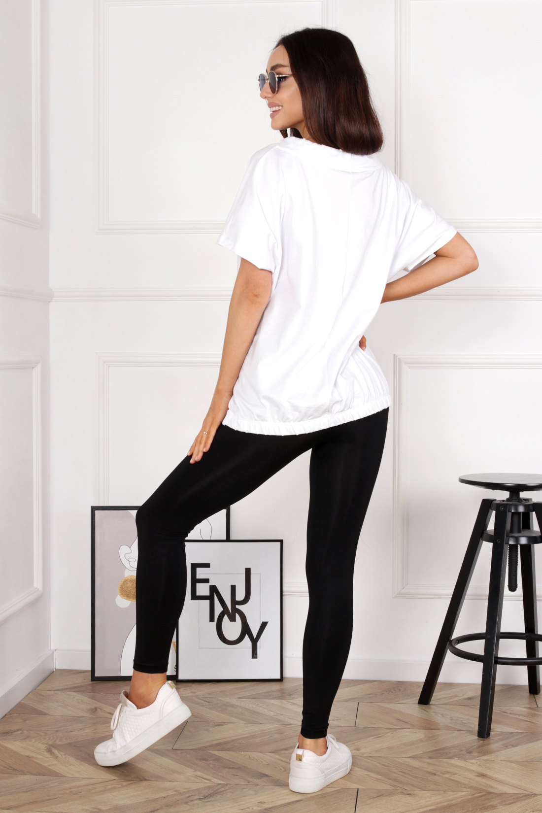 Bluzka z krótkim rękawem i ozdobnym nadrukiem. Model posiada ściągacz przy kołnierzu. Doskonały do sportowych oraz casualowych stylizacji.