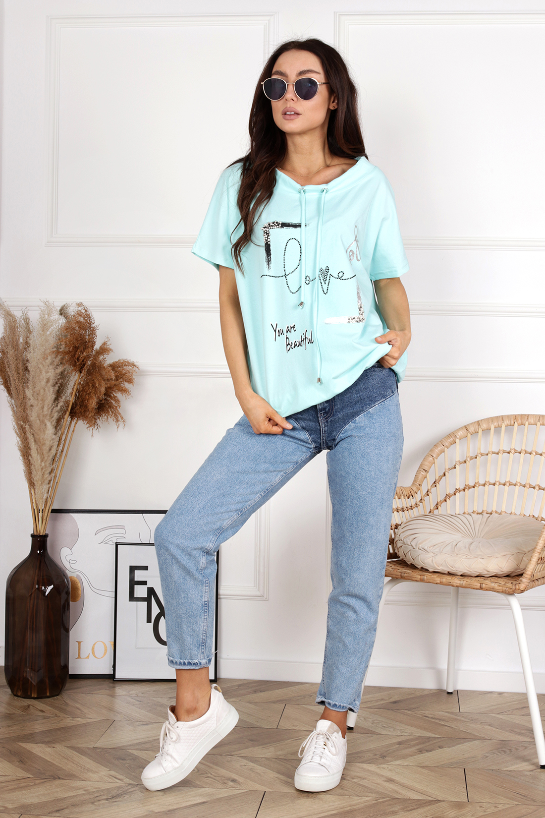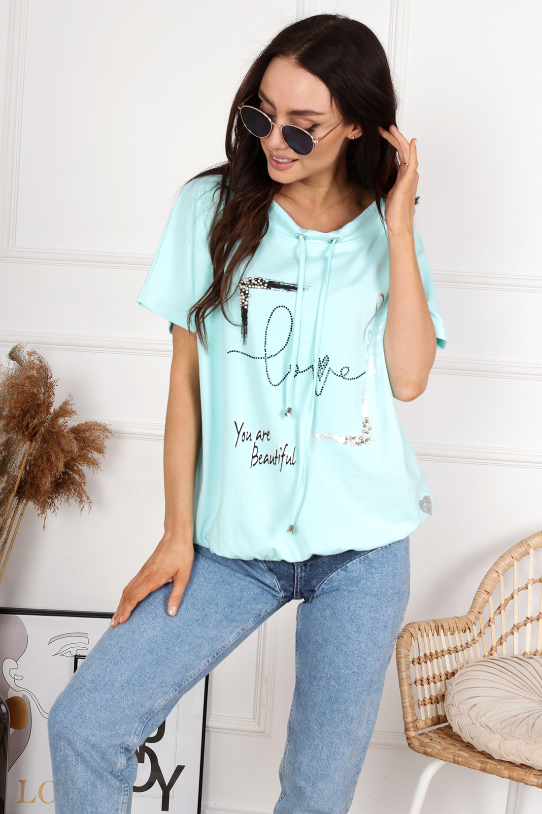Bluzka z krótkim rękawem i ozdobnym nadrukiem. Model posiada ściągacz przy kołnierzu. Doskonały do sportowych oraz casualowych stylizacji.