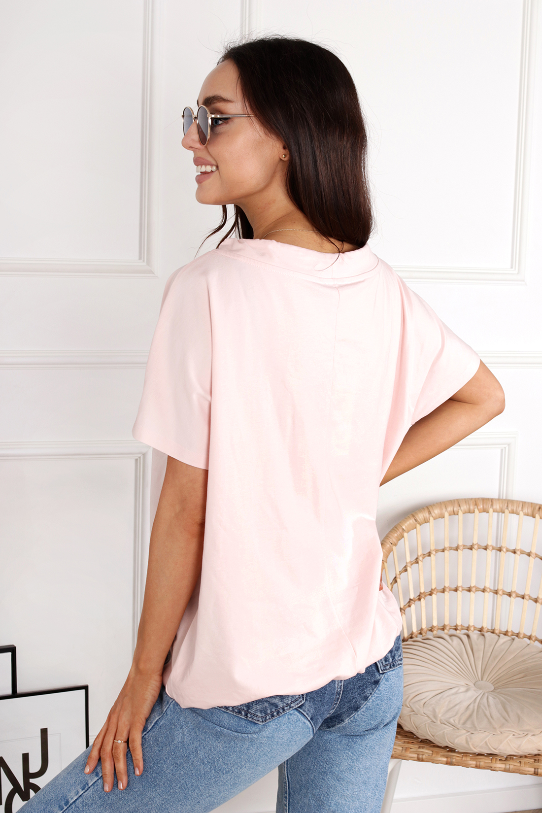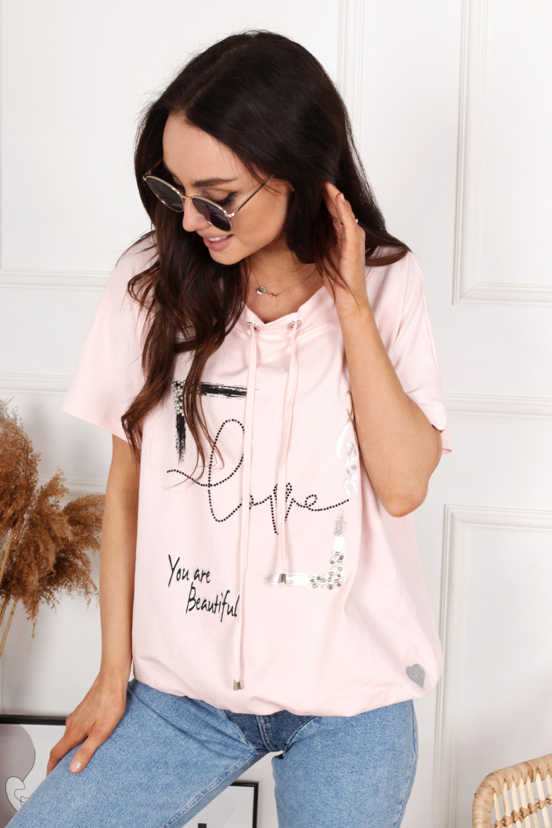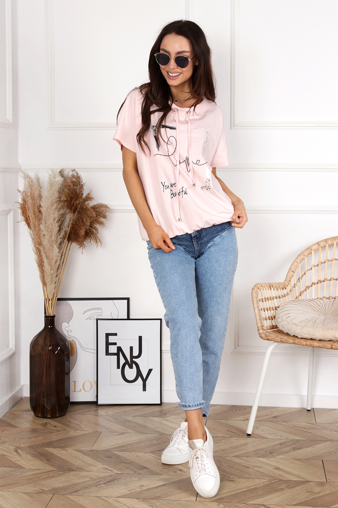 Bluzka z krótkim rękawem i ozdobnym nadrukiem. Model posiada ściągacz przy kołnierzu. Doskonały do sportowych oraz casualowych stylizacji.