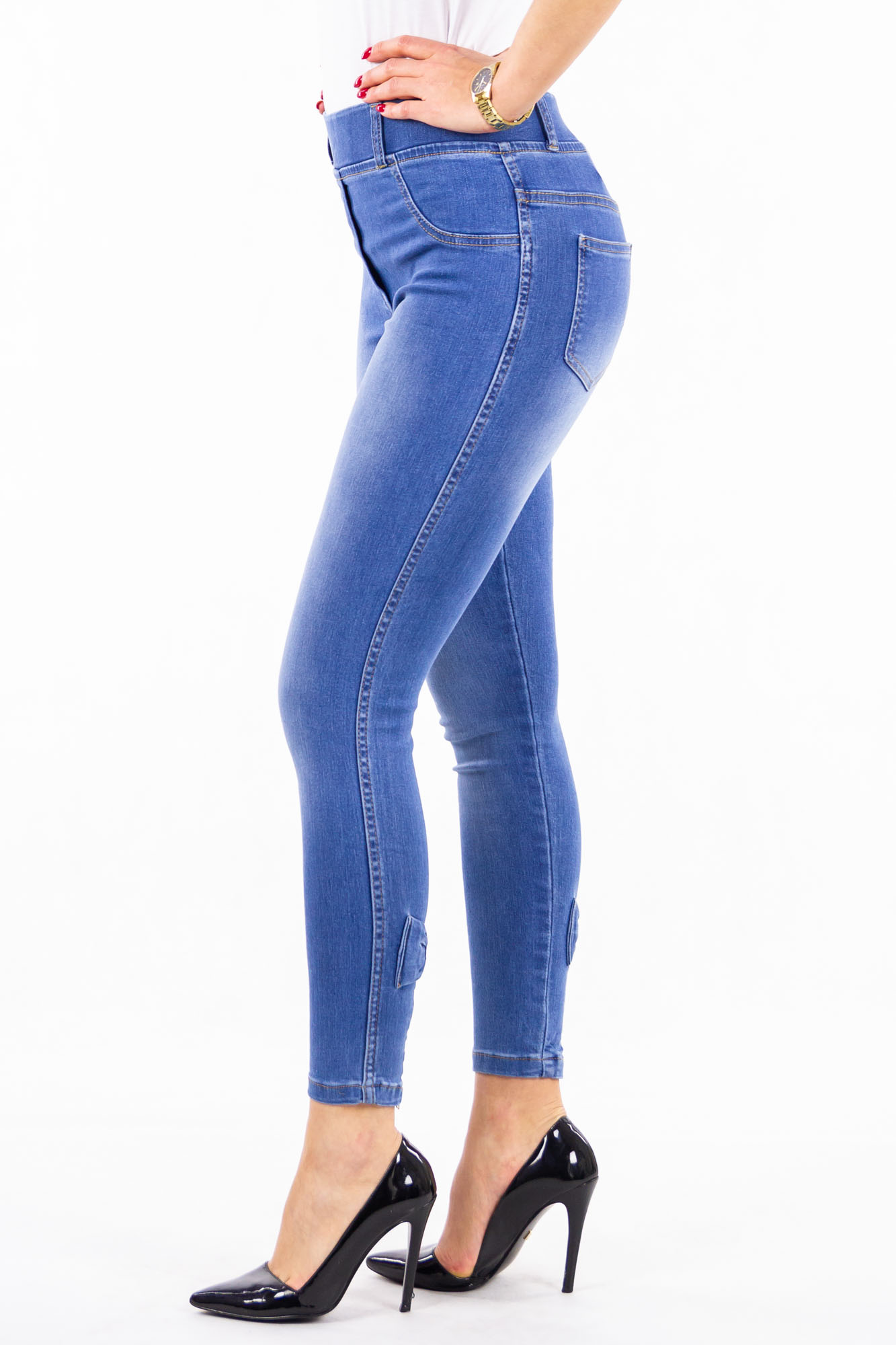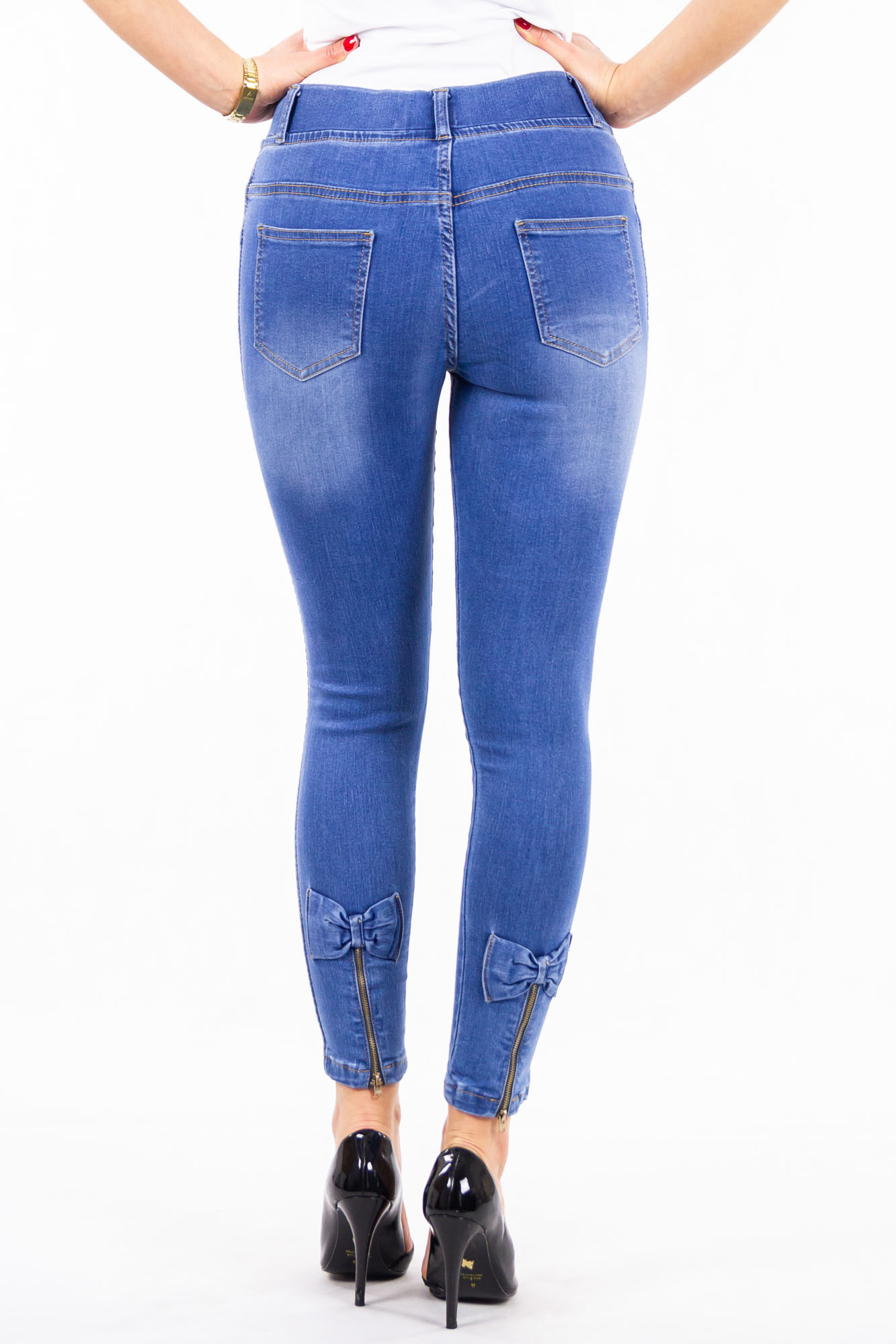 Spodnie jeansowe model posiada kokardy z tyłu na nogawkach , oraz kieszenie z przodu i z tyłu.