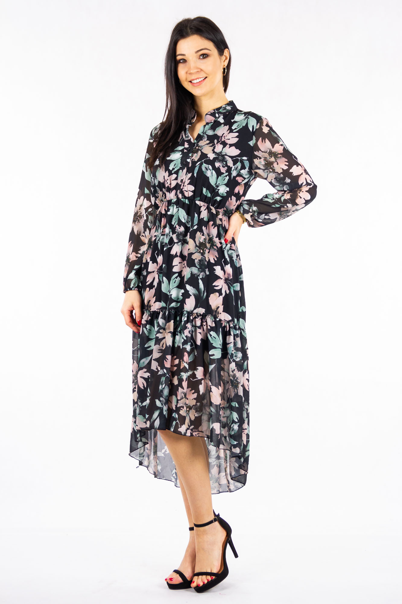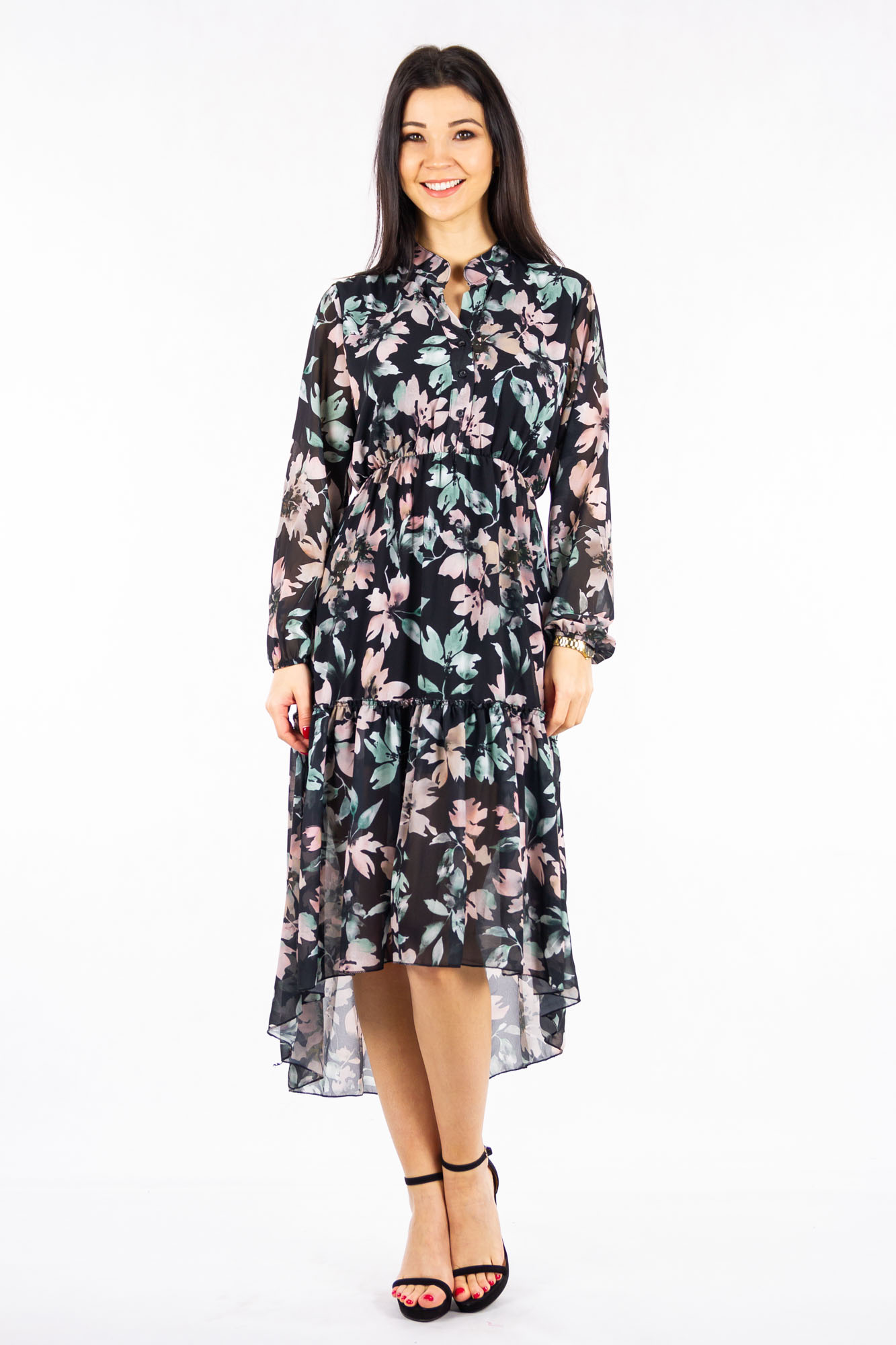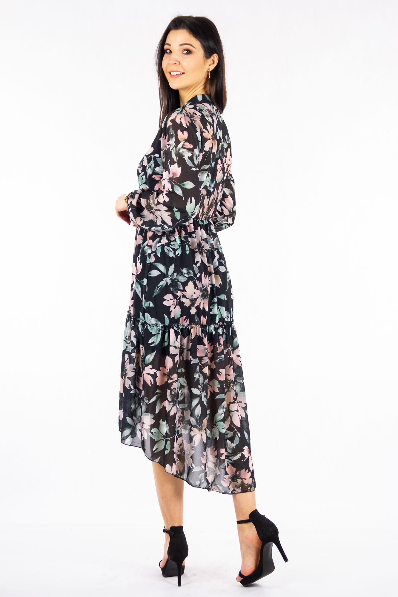 Długa zwiewna sukienka w kwiaty idealna na chłodne dni